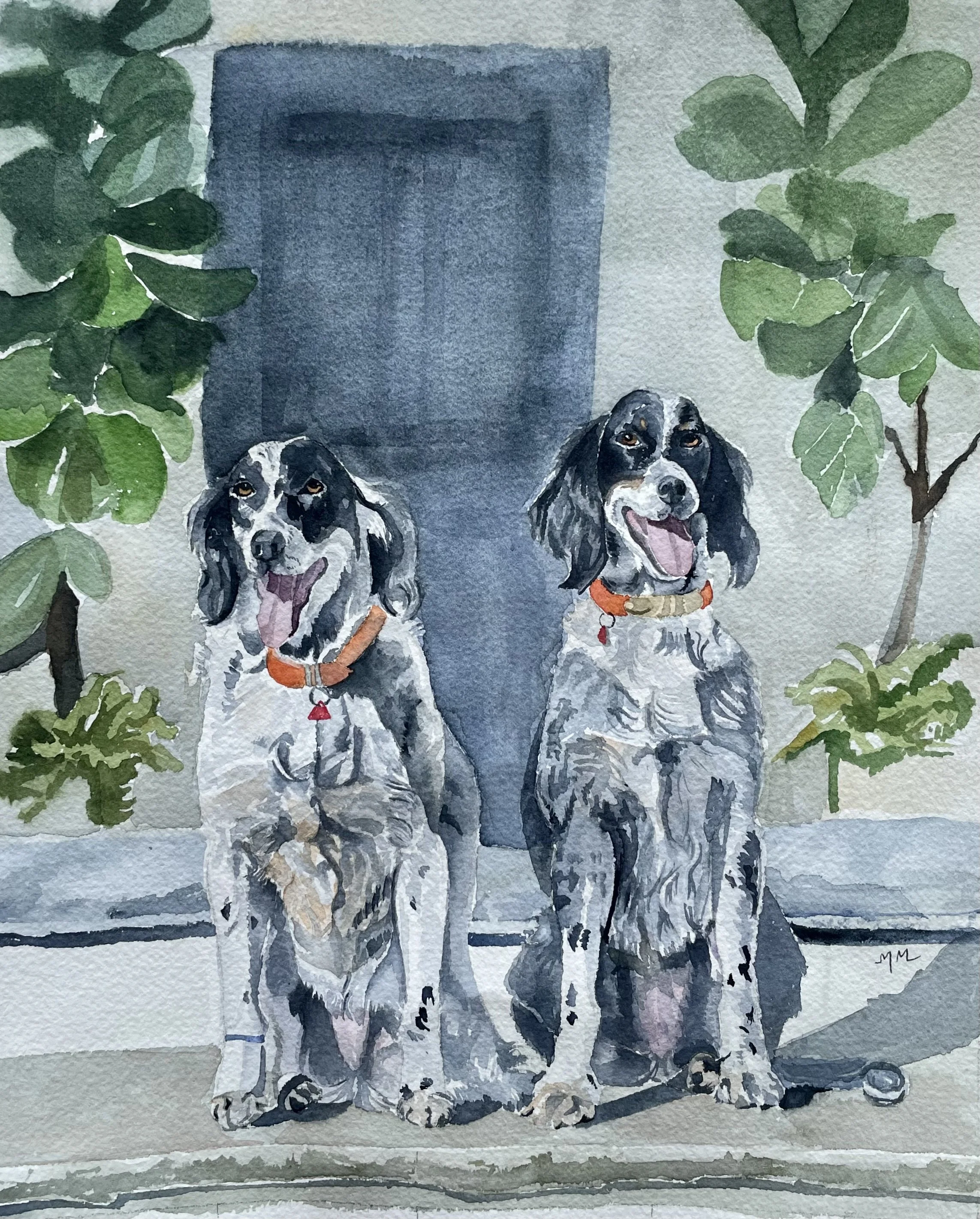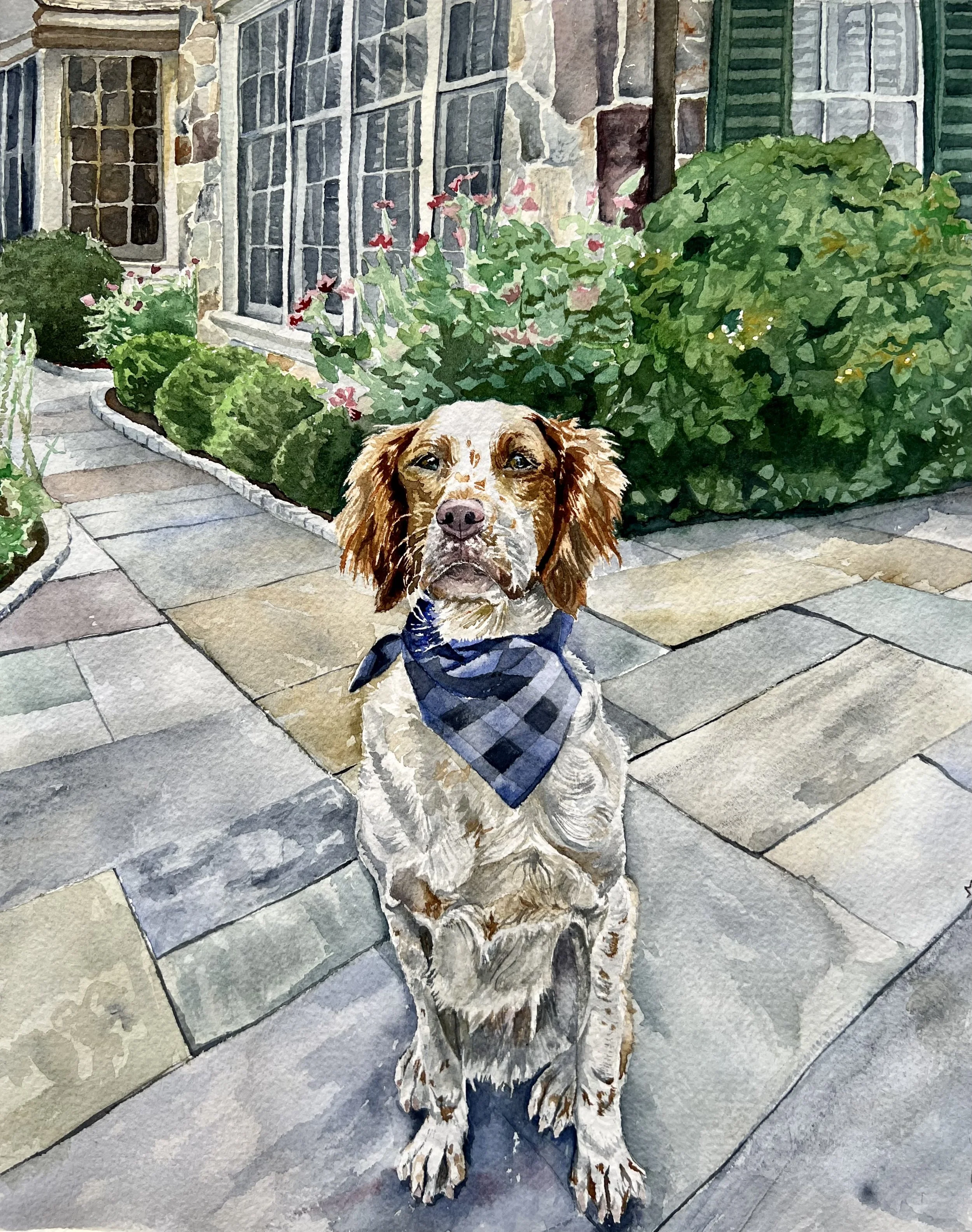 Beau on the Patio watercolor, 9.5” x 11.75” completed 2022 for Peter and Barbara